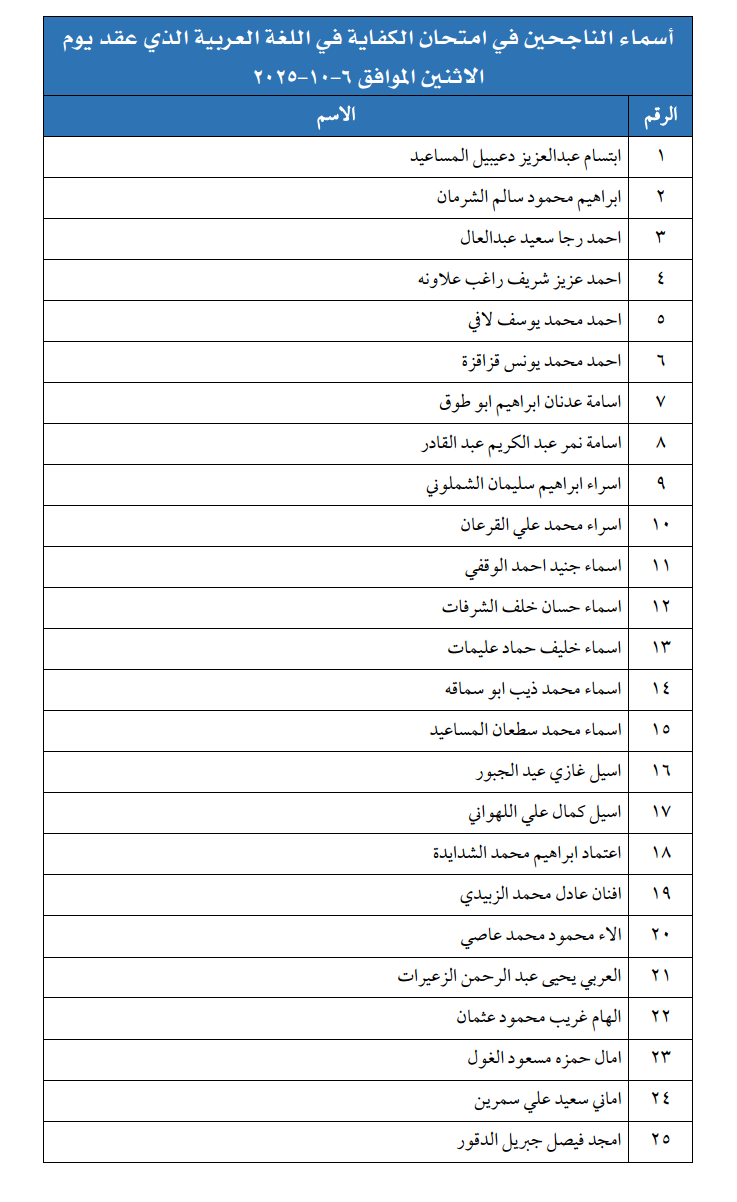 أسماء الناجحين في امتحان الكفاية في اللغة العربية الذي عقد يوم الاثنين الموافق 6-10-2025 2025-10-07 shefaa شاركها ! tweet