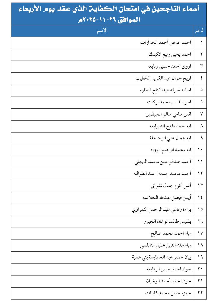 أسماء الناجحين في امتحان الكفاية في اللغة العربية الذي عقد يوم الأربعاء الموافق ٢٦/ ١١ / ٢٠٢٥م 2025-11-27 shefaa شاركها ! tweet