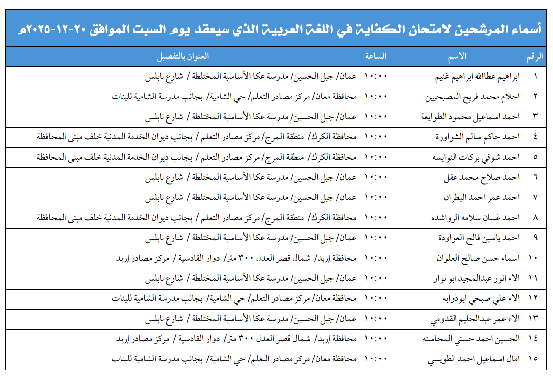 أسماء المرشحين لامتحان الكفاية في اللغة العربية الذي سيعقد يوم السبت الموافق ٢٠-١٢-٢٠٢٥م 2025-12-16 shefaa شاركها ! tweet