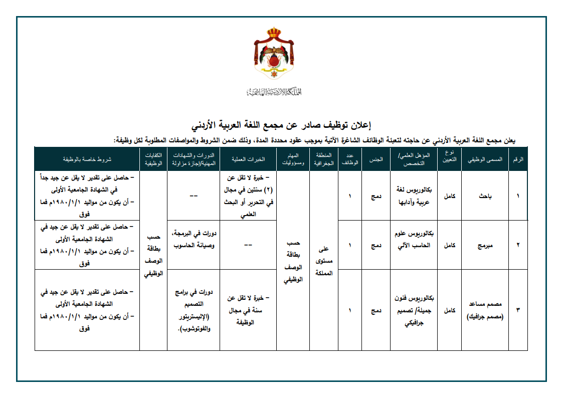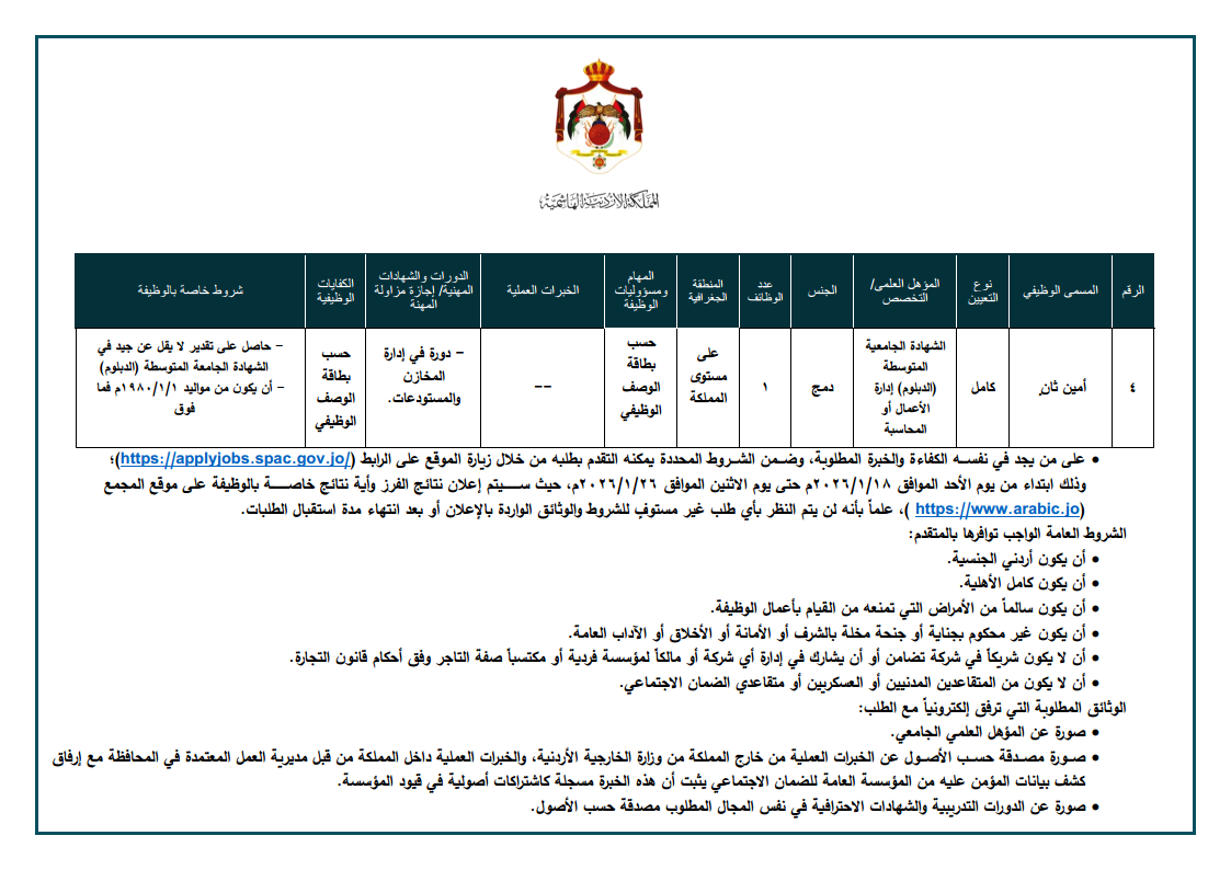 على من يجد في نفسه الكفاءة والخبرة المطلوبة، وضمن الشروط المحددة يمكنه التقدم بطلبه من خلال زيارة الموقع على الرابط (https://applyjobs.spac.gov.jo/)