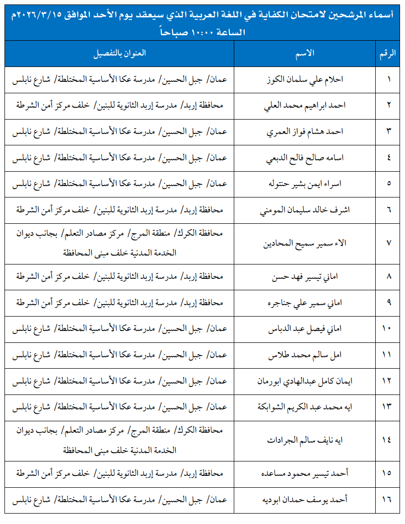 أسماء المرشحين لامتحان الكفاية في اللغة العربية الذي سيعقد يوم الأحد الموافق 15/3/2026م 2026-03-12 shefaa شاركها ! tweet